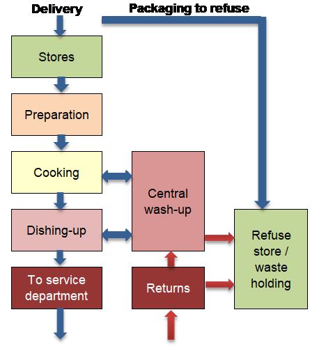 The transport corridors must be covered with an even surface, and ramps should be within the design tolerance required by the food trolleys. Alternative routes should be available in emergency situations. Due to the nature of the activities taking place in the catering department, it is a high fire-risk area. Fire-fighting vehicles should therefore need to have immediate and easy access to the unit.