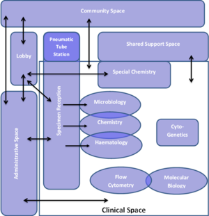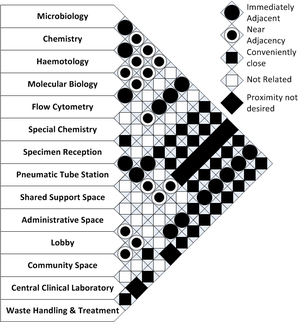 From the adjacency matrix, a space planning inter-relational diagram such as one depicted in the Lab Interrelationship Diagram. is developed. This diagram subsequently informs the development of the facility layouts. The example given indicated the flow of samples in the facility. Similarly the flow of staff and patients should also be described on such a diagram. This planning step is useful to ensure the relationships between processes and spaces are well understood and accommodated in this highly technical and variable environment. Waste storage and treatment areas are not shown in the example given.