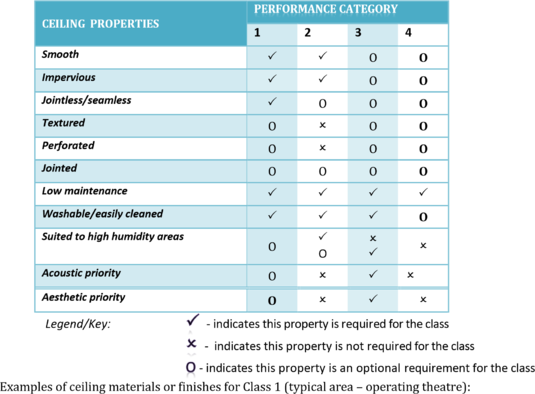 The design principles on the above documents must be taken into account alongside the recommendations of this document. For example: Clause 32 of the R158 states under general requirements in the OT Unit that the ceiling must be dustproof, of smooth impervious material, painted white or light-coloured suitable washable paint.