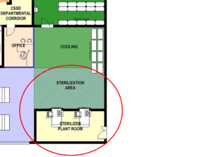Plant and equipment in service areas would need access from outside the CSSD, in order not to compromise the desired level of cleanliness in the unit. In some situations direct access between the plant area and the steriliser is required in order to allow access for maintenance staff to the equipment controls in the CSSD area side. | Plant and equipment in service areas would need access from outside the CSSD, in order not to compromise the desired level of cleanliness in the unit. In some situations direct access between the plant area and the steriliser is required in order to allow access for maintenance staff to the equipment controls in the CSSD area side.[[File:Departmental relationships.png|thumb|none|Figure 1: Departmental relationships (IUSS:GNS Adult Inpatient Services)|361x361px]] | ||