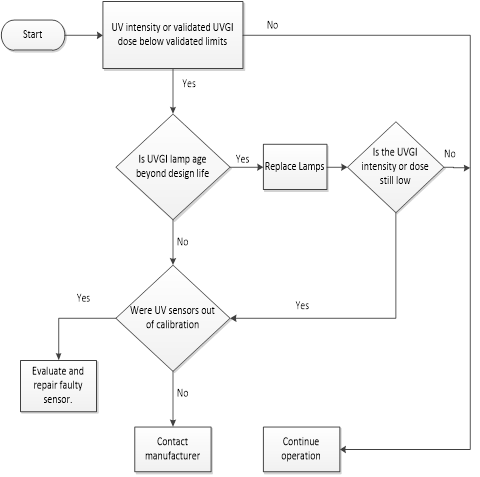 The surface UVGI system should be equipped with sensors that automatically monitor UV intensity, validated UV dose and lamps status. A decision chart for UVGI surface disinfection system monitoring is shown below.