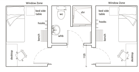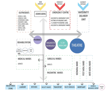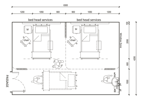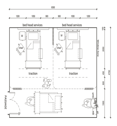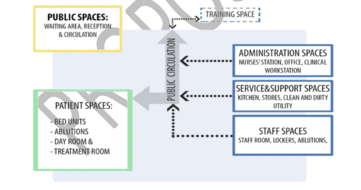 • All pipes for sanitary requirements should be placed on external walls. Service support facilities and top-up of stores or pharmaceuticals and food delivery should be accessible to the inpatient units without compromising privacy or noise levels.