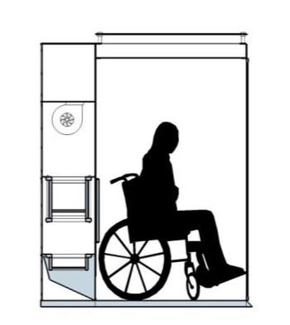 • The overall length of the booth could be reduced by about 150 mm. This would still provide enough space to accommodate a person in a wheelchair.