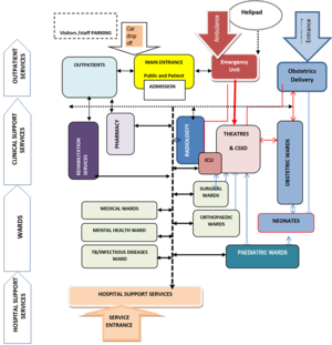 Ideally it should also be on the same level as the wards in order to reduce reduce the transport distance for food and the movement of people. See Figure 1.