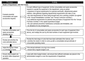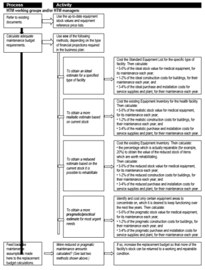2. Stock value estimates 3. Budget lines for equipment expenditures. 4. Usage rates for equipment-related consumable items. 5. Reference materials. 6. Developing the vision of service delivery for each facility type. 7. Standard Equipment Lists. 8. Purchasing, donations, replacement, and disposal policies. 9. Generic equipment specifications and technical data. 10. Capital budget calculations. 11. Recurrent budget calculations. 12. Equipment development plan. 13. Equipment training plan. 14. Core equipment expenditure plan. 15. Core equipment financing plan. 16. Annual equipment planning and budgeting. 17. Monitoring progress. |